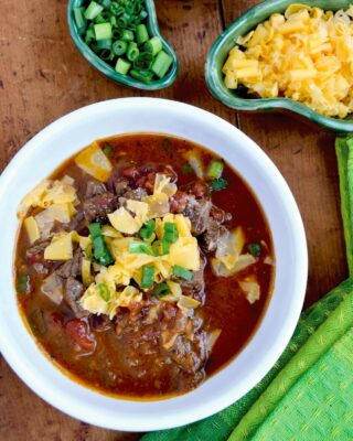 This Tex-Mex chili with chunks of tender beef, is always a crowd pleaser and a great way to feed one too. Make it in the pressure cooker or on the stovetop. Then, keep it warm and set up a chili bar and let everyone help themselves. The meat will continue to get tender and the chili is even better on day two.