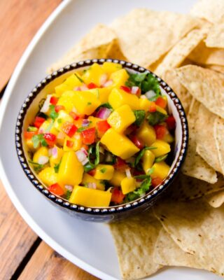 This fresh mango salsa is light, bright, and delicious. The sweet mango pairs perfectly with the spicy Jalapeño peppers. It’s great on all your Mexican favorites or you can use it to top off grilled fish and chicken too. My favorite way might just be on a plain old salty tortilla chip though…
