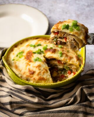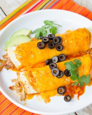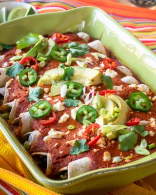 Make enchiladas easily by stacking them in a casserole dish for a delicious baked option with a creamy pepper jack cheese sauce. If you have a round casserole dish to make these in, it’s even better. Then, just slice it like a pie and serve.