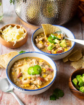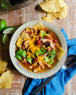 Any dinner that includes tortilla chips is a great dinner to me! Put all your favorite taco toppings in a bowl of this zesty soup and make it in your pressure cooker or on the stovetop. This is a recipe from my cookbook “Delicious Under Pressure” and it’s a favorite of mine.