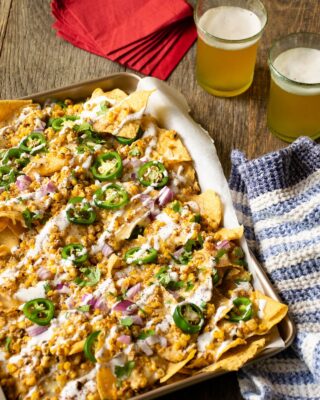 There will never be too many versions of nachos in the world. This recipe takes all the flavors from fun Mexican street corn and tops off a pan of tortilla chips for amazing and unique nachos! This one’s a winner for Cinco de Mayo or any day.