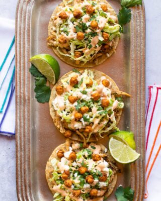 These tostadas have an air fried tortilla base topped with chicken, cabbage, queso fresco, chipotle crema, and roasted chickpeas. It’s a party of flavors and textures in your mouth, but be sure to have a plate to catch anything that falls.