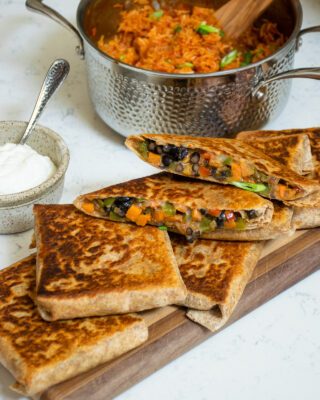 Skip the meat with this terrific vegetarian burrito filled with sweet potatoes, black beans, peppers, onions, and of course a little cheese too! These get pan fried as pockets making them portable and easy to grab and devour.