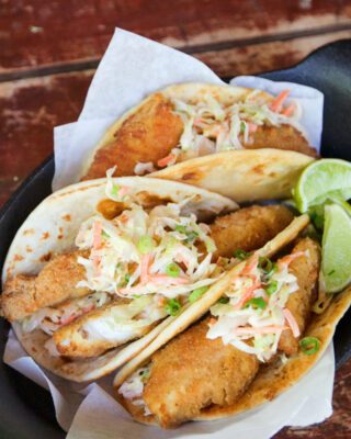 You will feel like the taco food truck just rolled up when you bite into these crispy coated fish tacos! The best part is the spicy Sriracha coleslaw piled on top. Yum! Make sure you warm and toast your tortillas and provide a stack of napkins.